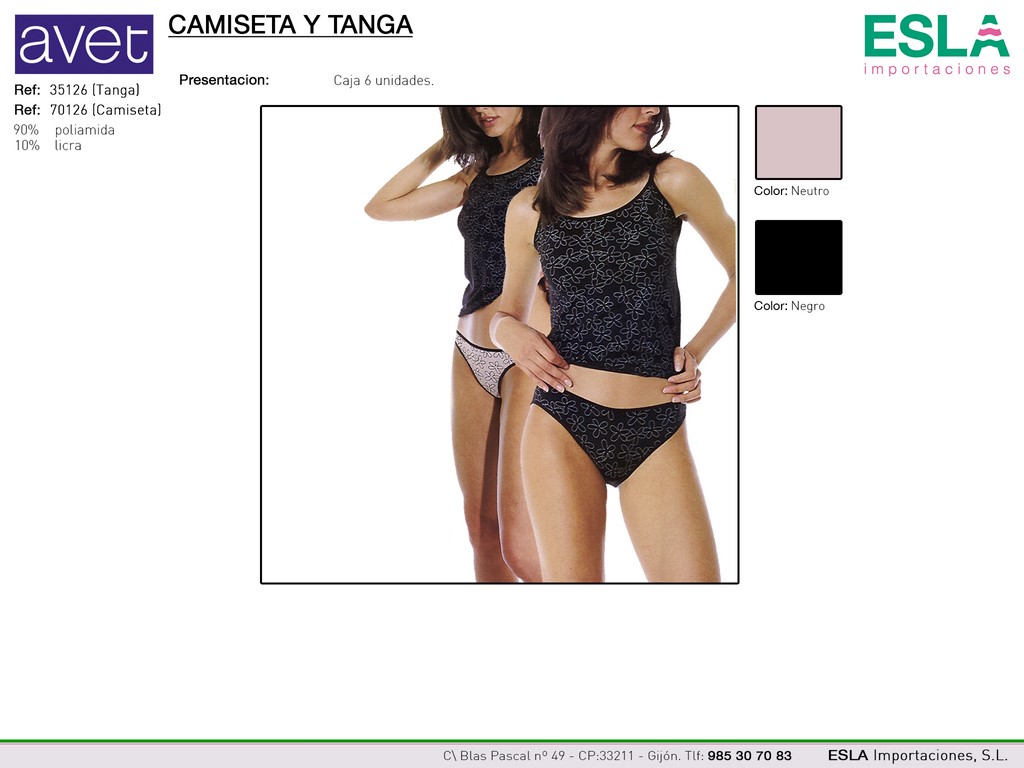 CONJUNTO TANGA 35126 Y CAMISETA DE TIRANTES 70126 AVETCamiseta y tanga para mujer. TAMBIÉN SE VENDE POR SEPARADO.REF: 35126 - 70126